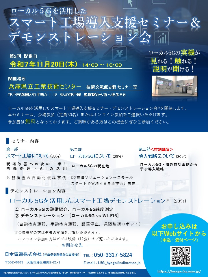 ホームnewsローカル5G 第4回 スマート工場導入支援セミナー&デモンストレーション会 ローカル5G 第4回 スマート工場導入支援セミナー&デモンストレーション会 第4回 ローカル5Gを活用した スマート工場導入支援セミナー&デモンストレーション会 この度、弊社は兵庫県業務委託事業者として、「ローカル5Gを活用したスマート工場導入支援セミナー&デモンストレーション会」を開催いたします。ローカル5Gは、製造業におけるデジタルトランスフォーメーションを支える革新的な技術です。本セミナーでは、スマート工場の導入事例からローカル5Gの基本までを詳しく解説し、実際のデモンストレーションを通じてその有効性を体感していただきます。 開催日 令和7年11月20日(木)14:00 ~ 16:00 開催場所 兵庫県工業技術センター技術交流館 2階 セミナー室 神戸市須磨区行平町3-1-12 ※JR神戸線 鷹取駅から西へ徒歩5分 ローカル5Gを活用したスマート工場導入支援セミナー・デモンストレーション会*を開催します。 本セミナーは、会場参加(定員30名)またはオンライン参加をご選択いただけます。参加費は無料となっております。ご興味がある方はこの機会にぜひご参加ください。 お申込みはこちら 下記のボタンからお申込みください(外部サイトリンク) 申し込む セミナー内容 第一部 スマート工場について(30分) 「現場改善への次の一手!画像処理・AIによる外観検査の自動化事例」 講師:株式会社ティーネットジャパン 第二部 ローカル5Gについて(25分) 「ローカル5Gについて」 講師:日本電通株式会社 第三部 【特別講演】導入戦略について(30分) 「ローカル5G・海外成功事例から学ぶ導入戦略」 講師:双日テックソリューション株式会社 PDF資料はこちら デモンストレーション内容 ◼️ローカル5Gを活用したスマート工場デモンストレーション*(30分) ① ローカル5Gの設備紹介、ローカル5G速度測定② デモンストレーション [ローカル5G vs Wi-Fi6] (自動検査運転、手動検査運転、設備停止、ロボット遠隔操作)※会場参加の方はデモの実演をご覧いただきます。オンライン参加の方はビデオ映像(12分)をご覧いただきます。