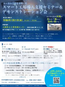 ホームnewsローカル5G 第5回 スマート工場導入支援セミナー&デモンストレーション会 ローカル5G 第5回 スマート工場導入支援セミナー&デモンストレーション会 第5回 ローカル5Gを活用した スマート工場導入支援セミナー&デモンストレーション会 この度、弊社は兵庫県業務委託事業者として、「ローカル5Gを活用したスマート工場導入支援セミナー&デモンストレーション会」を開催いたします。ローカル5Gは、製造業におけるデジタルトランスフォーメーションを支える革新的な技術です。本セミナーでは、スマート工場の導入事例からローカル5Gの基本までを詳しく解説し、実際のデモンストレーションを通じてその有効性を体感していただきます。 開催日 令和8年 1月21日(水)14:00 ~ 16:00 開催場所 兵庫県工業技術センター技術交流館 2階 セミナー室 神戸市須磨区行平町3-1-12 ※JR神戸線 鷹取駅から西へ徒歩5分 ローカル5Gを活用したスマート工場導入支援セミナー・デモンストレーション会*を開催します。 本セミナーは、会場参加(定員30名)またはオンライン参加をご選択いただけます。参加費は無料となっております。ご興味がある方はこの機会にぜひご参加ください。 お申込みはこちら 下記のボタンからお申込みください(外部サイトリンク) 申し込む セミナー内容 ◼️第一部 スマート工場について(30分) 「現場改善への次の一手!ロボット・自動搬送機の活用」 講師:株式会社ティーネットジャパン ◼️第二部 ローカル5Gについて(25分) 「ローカル5Gの現在地」 講師:日本電通株式会社 ◼️第三部 【特別講演】導入戦略について(30分) 「ローカル5Gは「高い」?産業環境におけるCelona 5G LAN活用の実践」 講師:双日テックソリューション株式会社 PDF資料はこちら デモンストレーション内容 ◼️ローカル5Gを活用したスマート工場デモンストレーション*(30分) ① ローカル5Gの設備紹介、ローカル5G速度測定② デモンストレーション [ローカル5G vs Wi-Fi6] (自動検査運転、手動検査運転、設備停止、ロボット遠隔操作)※会場参加の方はデモの実演をご覧いただきます。オンライン参加の方はビデオ映像(12分)をご覧いただきます。